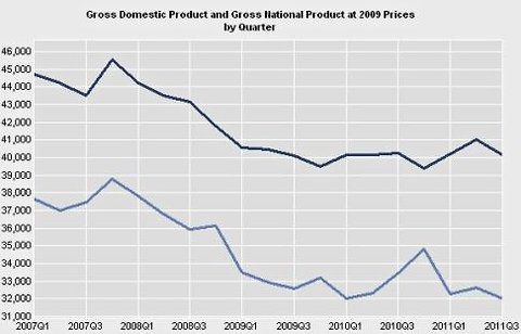 O Ministro das Finanças irlandês avisa que sem uma redução significativa do fardo da dívida as novas regras europeias não serão aprovadas em referendo. Cada um usa as armas que pode, menos em Portugal onde negociar com credores é de mau tom, coisa para populistas, sei lá. Quando olhamos para um gráfico com a evolução do PIB e do PNB irlandeses - a diferença deve-se, fundamentalmente, aos rendimentos que as multinacionais transferem para o exterior - percebe-se bem a atitude irlandesa: a recuperação austeritária só existe na imaginação de elites tão subalternas quanto ignorantes (via Paul Krugman). Como é que se diz ''ponham-se finos'' em inglês ? (-por João Rodrigues)