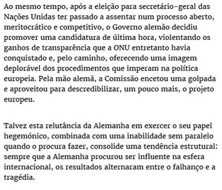-------(J.Freitas): ... veja o problema de maneira diferente. A Europa, potência militar supletiva dos EUA, vive neste momento a sua apoteose ultra liberal. A "Lei Trabalho" (reforma laboral, pró neoliberal), que parece inspirar o seu texto (de F.S.Costa), e algumas reticências do mundo do trabalho, e não só, a aceitar o que se prepara no famoso Tratado transatlântico (TTIP), é inspirada e desejada pelos EUA (/...). Se o terrível vírus socialque é a "Lei Trabalho" nos cai em cima, não é para "reformar a França modernizando-a", como diz o social-liberal Manuel Valls (1ºMin.Fr.). Claro que não. Ou então é preciso explicar por qual milagre um governo de direita na Bélgica e um suposto de esquerda em França, promulgam ao mesmo tempo regras idênticas que estrangulam os trabalhadores? Muito simples: A "ordem" ou a "ideia" vem da Comissão Europeia (ou do ilegal Eurogrupo) um 'truc' infestado pelos lobbies de toda a espécie . Em Bruxelas, que o Senhor conhece bem, 40 000 (lobistas) pessoas são empregadas por estas oficinas "deinfluência" (corrupção e ameaça) que submetem ao Parlamento (, à Comissão, ao Conselho, às DG..., ao Eurogrupo e ao BCE) europeua versão dos factos (e as pré-propostas) que convém melhor à Wall Street (/ City/ alta finança, transnacionais e magnatas), não o que é melhor para a U.E., para os Estados e para a generalidade dos cidadãos. Assim, libertados desta "tarefa" ingrata, antes de ir beber uma cerveja à "buvette", os deputados (comissários, dirigentes, ...) europeus não têm mais nada a fazer que dizer SIM a estes lobbies que se activam para a nossa felicidade. Fecundada pelos EUA, a Europa são eles, a U.E. foi 'tomada/ capturada' (pelo euro/...) e é 'coutada' de todo-poderosos com seus fantoches e avençados (idem para os EUA, "seu" governo e 'democracia' ... e para a maioria dos Estados/ países). As elites do capitalismo francês (banqueiros e/ou deputados) e muitos dos seus compadres de estados vizinhos, têm a necessidade de apoiar a sua politica sobre um país que desempenha para eles o papel de modelo. Juncker e outros papagaios da (alta finança...) Goldman Sachs podem lançar tranquilamente a sua "fatwa" de ultra liberalismosobre os trabalhadores : "não há alternativa" ! Eis porque uma "Lei Trabalho" (e as "reformas estruturais"...) nos cai em cima, reclamada pelos 'corretores dos mercados' e gestores dos Fundos $€£€$de Pensão Alemães e Estado-unidenses (...), que são à justiça social o que (vampiro) Drácula é à transfusão sanguínea. Tenho quase muita pena destes 'pobres' industriais e banqueiros e os seus comparsas políticos (e militares, 'jornalistas', advogados,...) de afrontarem tantas incertezas, sendo obrigados a volver, como os espectadores de ténis as suas cabeças entre Washington e Berlim ! (ou será entre a sua 'imunidade' da morada legal 'offshore' e a bolsa de valores na 'net' ?!) Não esquecer a responsabilidade da derrota de 1940, em França face aos Nazis: Os militares, os políticos, a imprensa, os homens de negócios e os homens de mão !