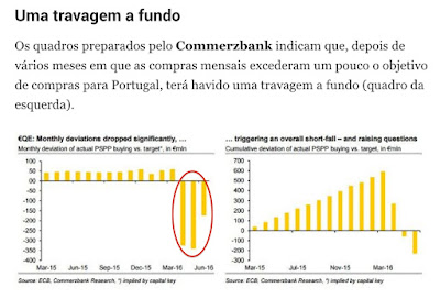 Porém, a resistência do Governo às aplicação de medidas de austeridade adicionais (leia-se: recusa da total submissão) suscitou a raiva dos falcões do Eurogrupo, da CE e do BCE. Isso foi motivo bastante para, invocando a necessária "prudência" (a mesma que teve de adoptar com a Grécia), desde Março o BCE ter passado a comprar dívida pública portuguesa em quantidades muito abaixo do nível a que vinha fazendo ("travagem a fundo", regozija-se o Observador). É esta dinâmica que António Costa e os seus aliados não podem contrariar, por muito que protestem.