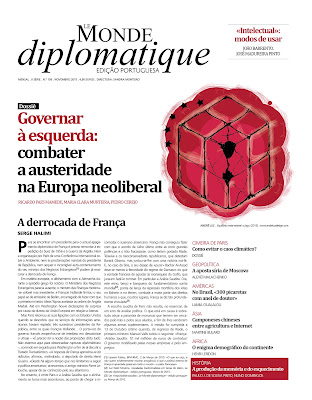 R.Paes Mamede no Le Monde diplomatique - ed.port. deste mês – Prioridades para um governo apoiado pelas esquerdas em Portugal. Na linha do seu livro, claro e distinto, este é um artigo sobre economia e política económica nacionais que articula e desenvolve três reflexões que o Ricardo já fez neste blogue e que vale sempre a pena revisitar neste novo e empolgante contexto: o triângulo das impossibilidades da política orçamental; a coligação de direita tem um projecto claro e coerente para o país; um terreno minado por todos os lados. ...