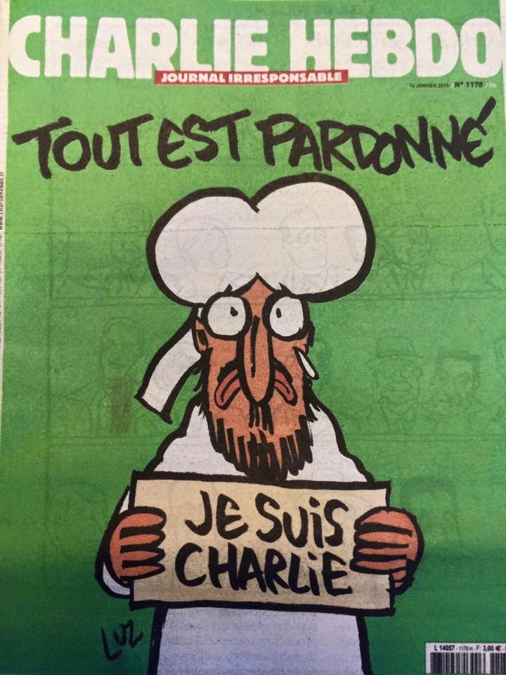 Hoje, em França, estão nas bancas 3 milhões de exemplares do jornal Charlie Hebdo, cuja primeira página surge com este cartoon... (Maomé também chora...) Os sobreviventes da tragédia pretendem, com esta publicação, prestar homenagem aos colegas assassinados e afirmar que, de facto, nenhum líder religioso pode, em consciência, defender a violência e a morte como forma de afirmar as suas convicções! ...Treta da semana: a sandes pública. (-por Ktreta, 31/8/2014)