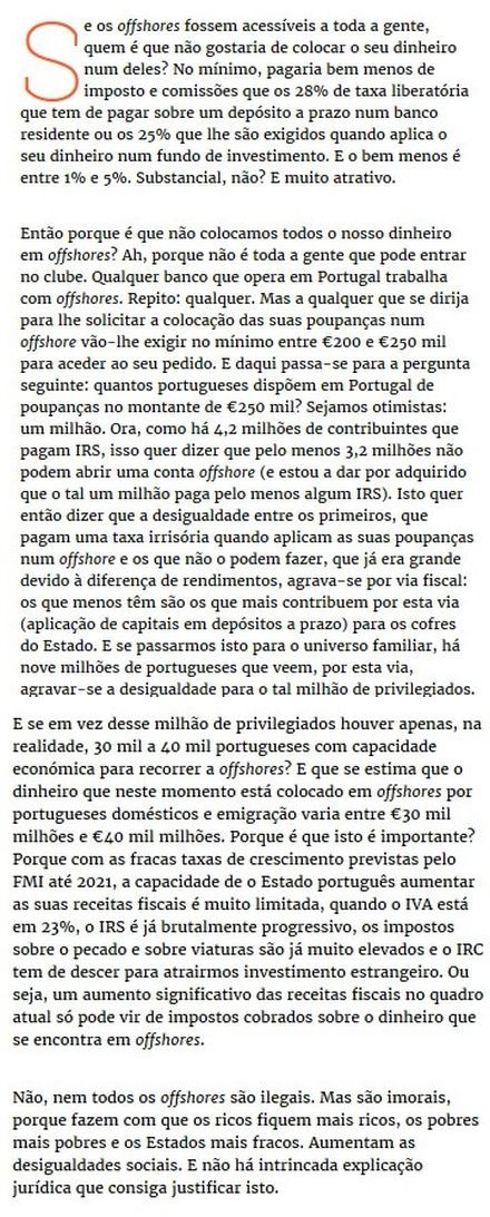Eis a lista dos paraísos fiscais considerados por Portugal como paraísos fiscais(offshores) em que se procedeu à eliminação da lista dos paraísos fiscais de Jersey, Ilha de Man e Uruguai... por terem aderido às convenções de troca de informações. A formulação é muito infeliz: "a lista dos países, territórios e regiões com regimes de tributação privilegiada, claramente mais favoráveis"... Para lá, da ideia macabra de ter sido retirado da lista o Luxemburgo, mesmo depois de se ter provado que foi aí que se realizaram os acordos mais vergonhosos de isenção fiscal por parte de multinacionais mais ricas do planeta, a dúvida que se suscita é como extinguir estes buracos negros do sistema democrático? Como é que a social-democracia que sobra considera aceitável que todas as regras e convenções de troca de informação resolvam o problema, quando tudo prova que as regras sejam simplesmente ineficazes? Como considerar sistemas democráticos, a sistemas que viabilizam e necessitam - por necessidade de sistema - desses buracos negros como forma de retirar ao controlo democrático o valor criado na sociedade, em proveito privado de uma minoria de pessoas, deixando o sistema fiscal sobre o rendimento incidir sobretudo sobre o valor do trabalho e das pensões?