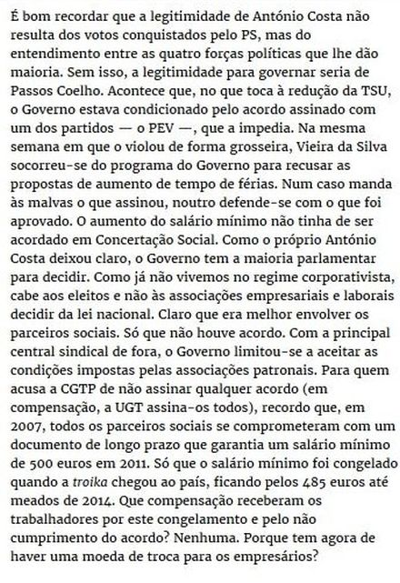 (...) Desconhecerá por acaso que o investimento público, em % do PIB nacional, corre o risco de atingir com este governo apoiado pelas esquerdas, graças à chantagem austeritária europeia, o valor mais baixo na democracia, prolongando trajectórias anteriores? Desconhecerá que quando em Bruxelas falam de investimento público em geral não estão a falar de Portugal, nem, de resto, de nada que seja macroeconomicamente significativa na escala europeia? E desconhecerá os efeitos das políticas da troika em matéria de aumento das desigualdades socioeconómicas? O que é que mudou nas recomendações da Comissão em matéria laboral, de prestações sociais ou de política económica orientada para a criação de emprego, os grandes determinantes da sua evolução? Será que desconhece o pensamento na Comissão em matéria de salário mínimo, por exemplo? E o que se pensa no BCE? (...)